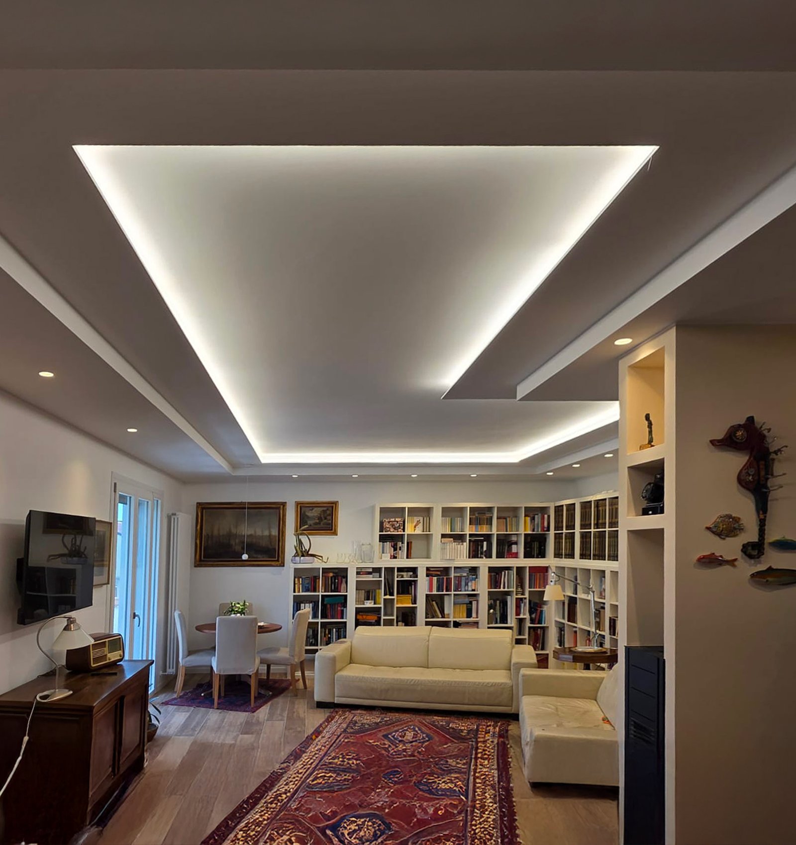 Progettiamo e realizziamo pareti, controsoffitti, velette, librerie, nicchie e boiserie interamente su misura.